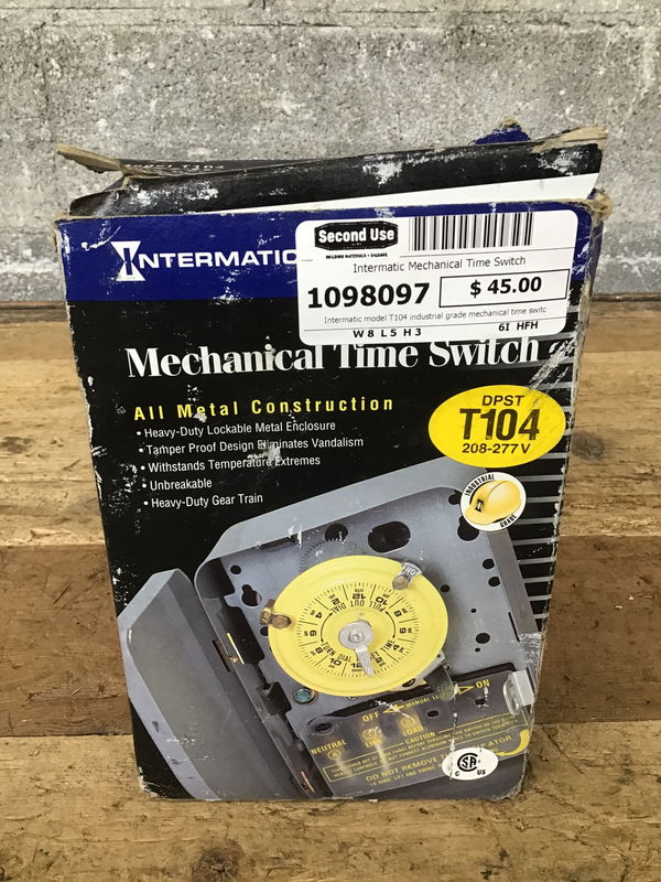 Intermatic model T104 industrial grade mechanical time switch. 208-277 V, 40 amp. The box is beat up but the timer itself looks untouched. Retails for $75 on Amazon.