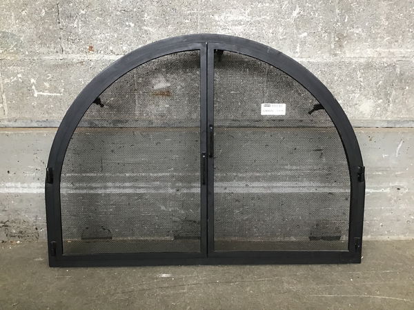 Fireplace door with a rounded top and unique offset handles for easier opening.