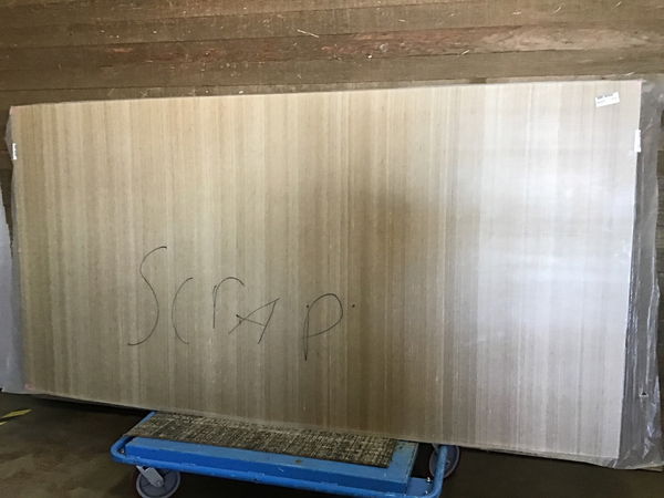 High end 1/8" thickness acrylic sheet with a fabric that gives a wood grain look sandwiched between two pieces of clear acrylic. This is a remnant from a commercial project, produced by Lumicor, Looks to be in overall good condition!