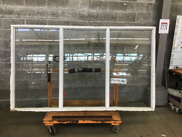 Fixed window with three panes, frame has some wear and splitting in a few places, but could still make a good addition to a greenhouse or shed.