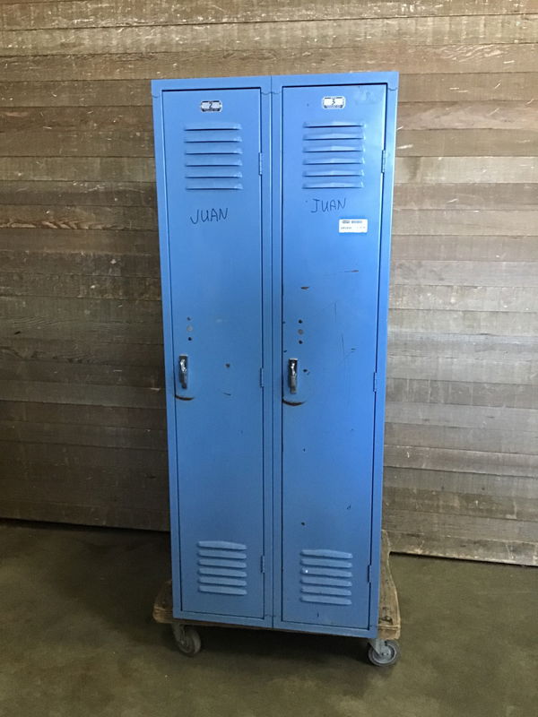Vintage bank of school lockers featuring two compartments on either side with smooth lever handles. Each compartment has a shelf and a few coat hooks for organizing your belongings. In great looking condition besides some names sharpied on the faces. One of the locking handles is broken so it's not so easy to open.