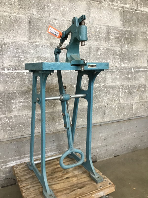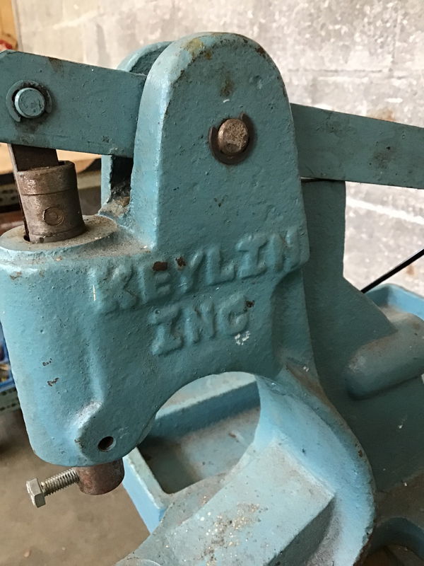A vintage kick press-operated snap machine for pressing grommets and eyelets and the like into textiles, manufactured by Keylin, Inc. with an aqua/teal paint job. Nowadays this stuff is automated, but I did find a matching version retailing for $450.