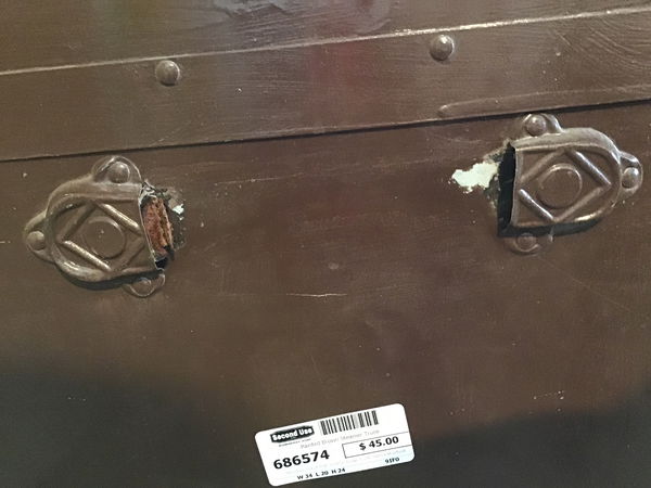 Would ya look at that- another brown trunk. Seems structurally sound, painted a bright red on the inside, latches seem to work but missing the key. Also, the leather handles are no more. Overall, still great as a storage solution.