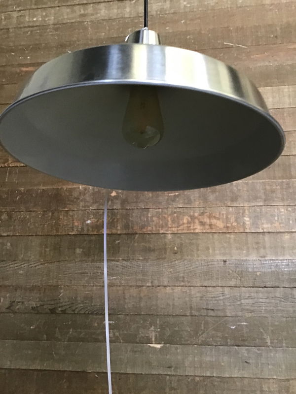 Industrial style pendant light fixture, with a brush nickel finish. Would be perfect for any modern aesthetic! Overall looks to be in good condition.