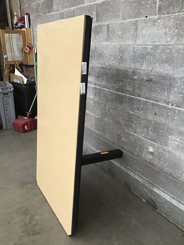 I believe this table was used in a breakfast nook, but with its heavy steel frame and ca. 2011 Caesarstone top, it could be used as an outdoor dining table. The flat edge bolts to the wall, and there's a post centered near the opposite end to hold it up.