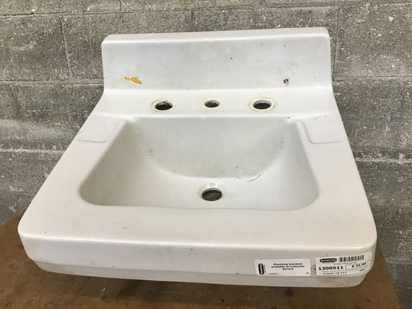 1963 Born wall-mounted bathroom sink by Crane. It's in good condition, clean and includes a pair of modern mounting brackets. Note: There is a chip in the enamel along the right side faucet hole, though I'm pretty sure an installed faucet will cover it up. Price reflects.