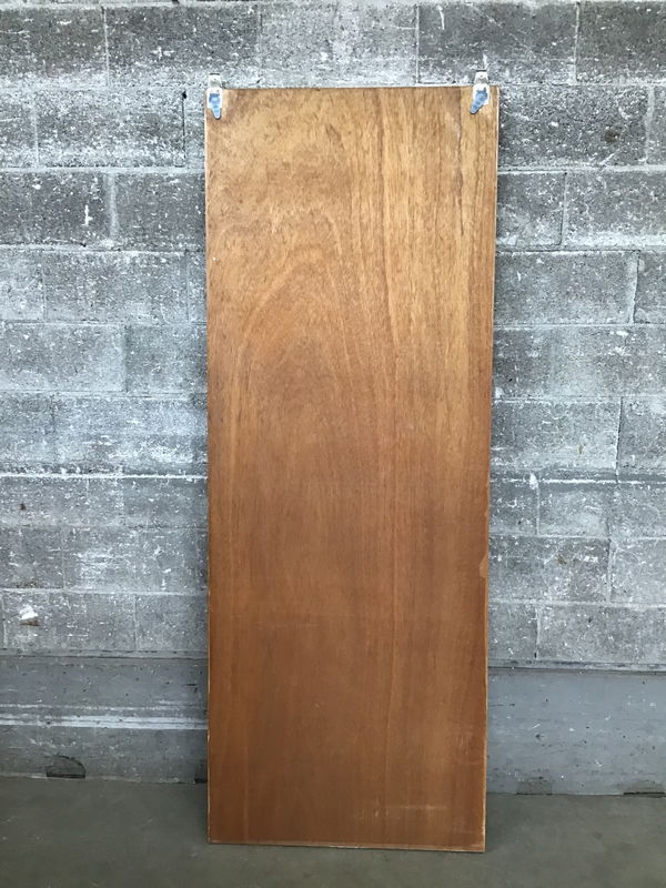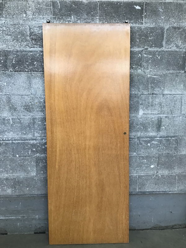 Flush face mahogany hollow core door bypass closet door with wheels on top. Has no hinge cuts, but may have a small, 1" diameter insert "handle" on one side. Could be drilled for a handle set. Came from a Loyal Heights midcentury home.