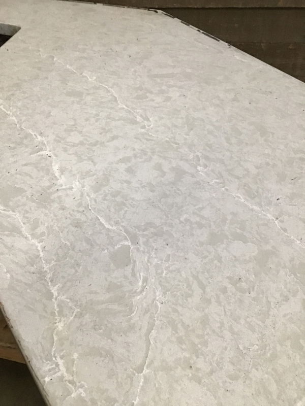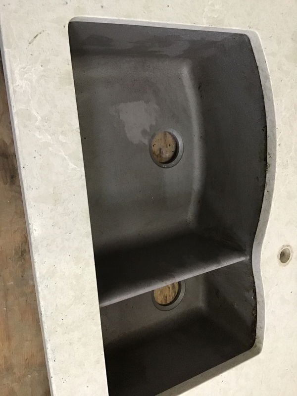 Double basin brown sink in a manufactured stone counter. Configured as a corner unit. You could cut off the ends and make a 36" wide rectangle.