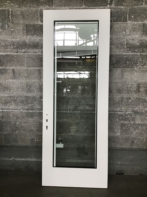 Full lite fiberglass exterior door with blinds, but no slide "handle" to operate them. Not sure if you could order them from Therma Tru or not. Price reflects it's been bored on the latch side for a five point lock system & missing blinds handle. Item may have cosmetic damage.