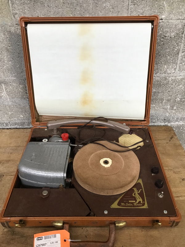 A relic from the bygone era of door-to-door salesmen, this is an on-the-go sales kit, perfect for the salesman of the 1950s! With a Viewlex V-44 slide projector, pull-down screen, and a built-in turntable that can play 78s, 45s, and 33-1/3s, it has everything you need except for something to sell! It's all packed into an orange-ish brown briefcase, and both the projector and turntable functioned when tested, although we didn't have any records to test the needle and speaker with. Obviously, these aren't manufactured anymore (I guess modern door-to-door salesmen use laptops instead, boring), we were able to find that functional Mr. Sales Masters sell anywhere from $240 to $130.