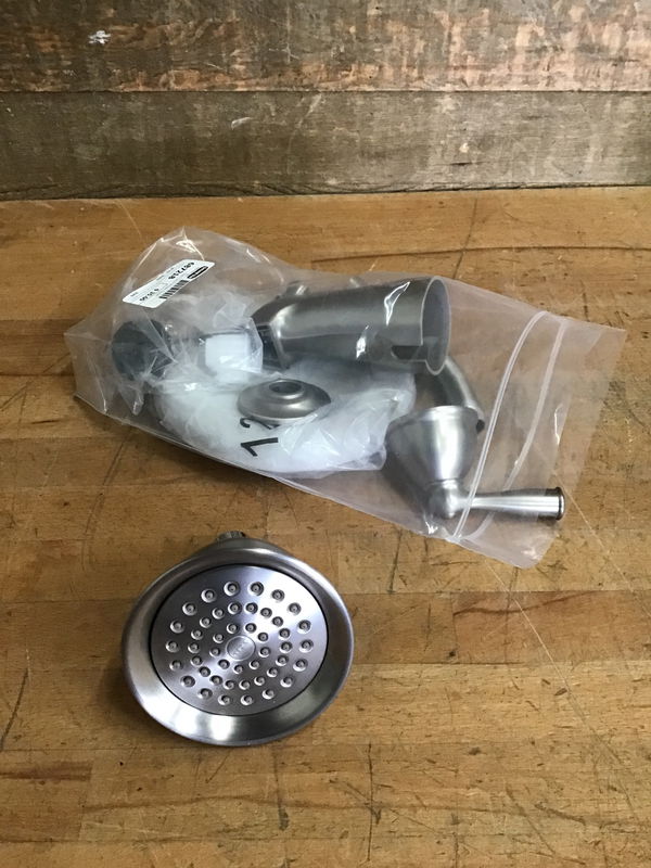 Banbury by Moen, tub and shower faucet set with a brushed nickle finish. This came to us unused in a damaged box. This includes the tub filler and shower head and some hardware. This item sells new in box stores for nearing $150! This one does not include the Posi-Temp Valve, price reflects.