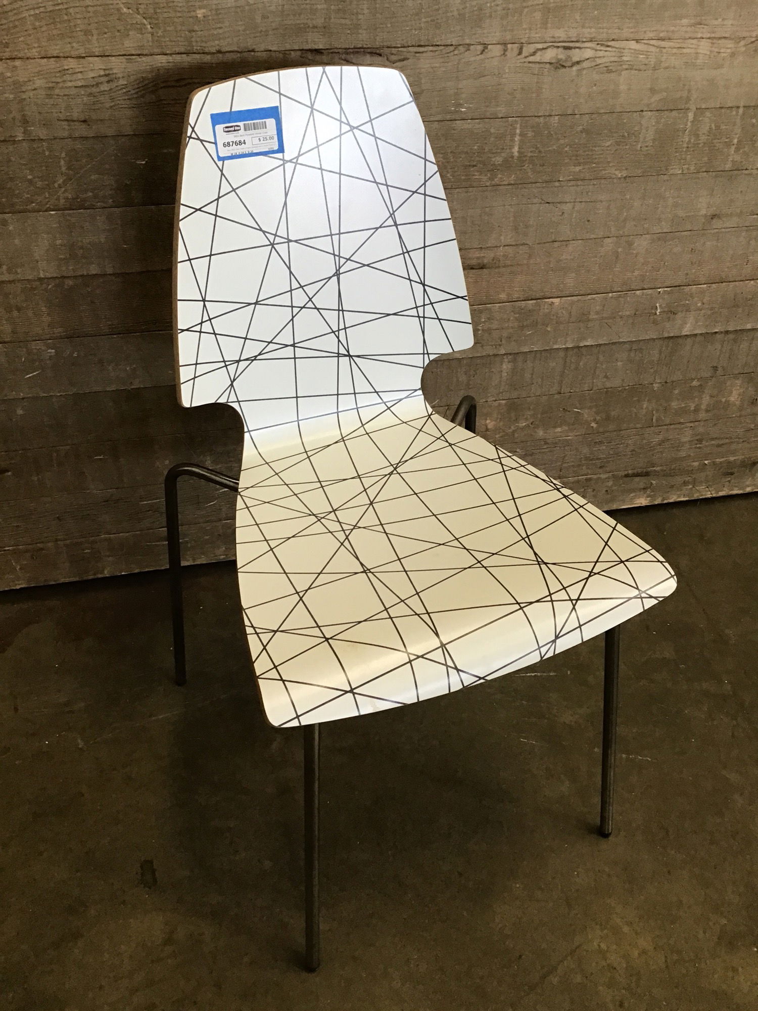 Nice IKEA chair made of bent plywood and a chrome finish on the legs. This one has a white face with abstract black lines.