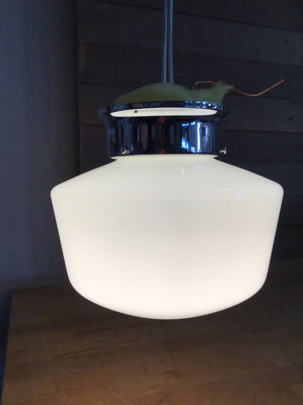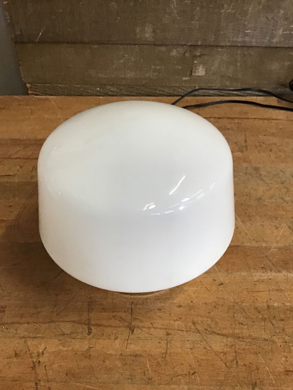 Cute, Milk Glass, Schoolhouse, Semi-Flush Mount Light Shade. Has a Nice Shape and Gives Off Great Ambient Light. Comes with a Chrome Fitter.