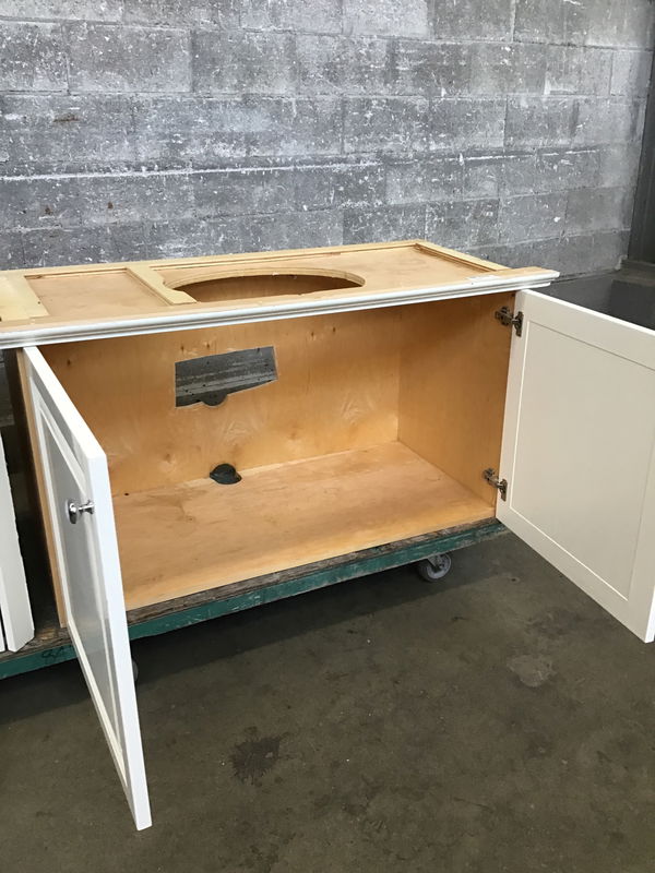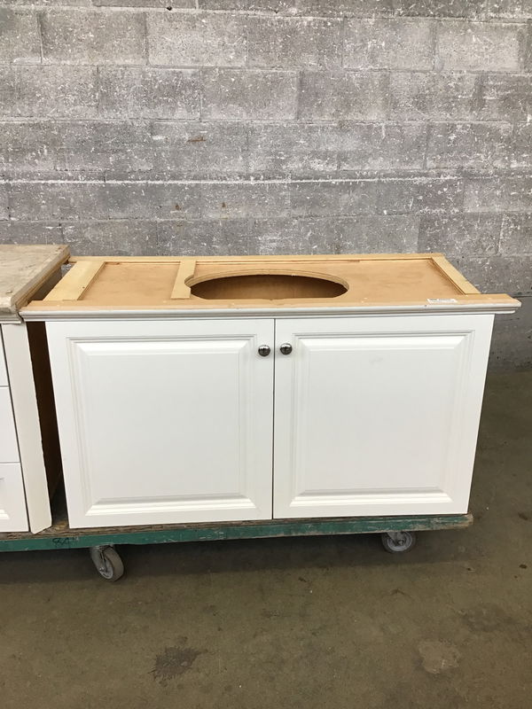 Professionally painted vanity base cabinet that's ready for your project. The top has a bunch of trim and extra support plywood pieces from the last installation where it held up an oversized countertop. Listed measurements do not include all of this excess trim but we left it incase you could use it. As-is, you could put on a roughly 48" x 24" countertop.