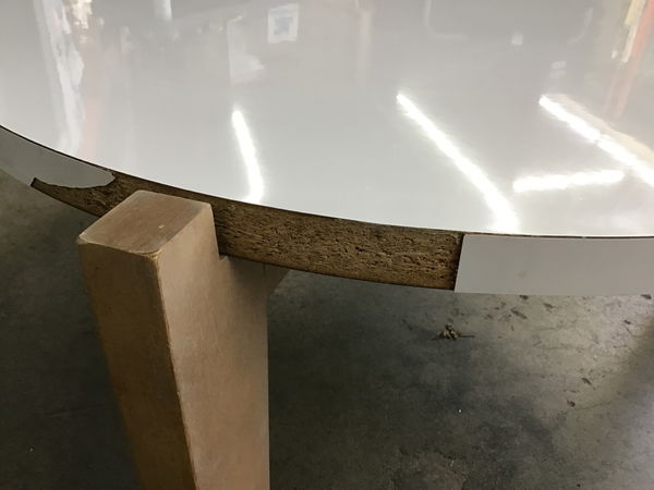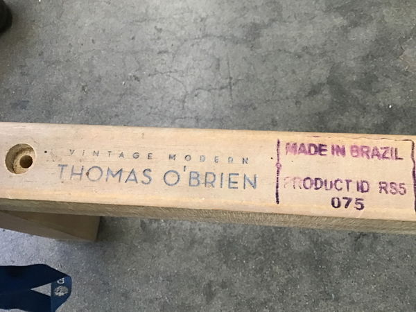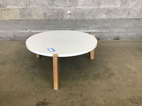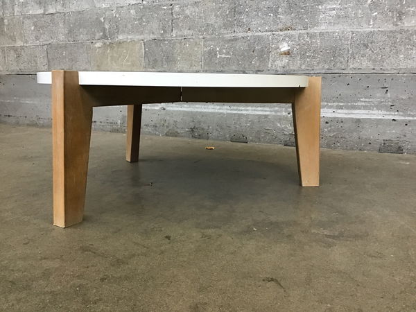 Vintage Modern coffee table by designer Thomas O' Brien. Three leg frame that claims to be composed of teak with a white laminate surface. There are some chips on the side of the table top, and the wood frame looks to have been repaired once before. Found restored here for $1250.
