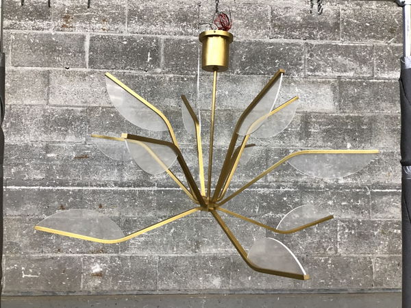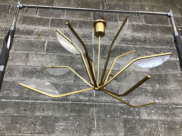 Contemporary lotus flower-inspired LED chandelier designed by Sean Lavin for Visual Comfort, with a dozen brass-finished arms and integrated underlit petal shades. One of the arms became disconnected and needs to be reattached - all you need is a tiny bit of all thread pipe, a nut, and some strong adhesive (or weld it if you're handy). Or you could just take off the arm across from it to make the whole thing symmetrical again... Whatever you do, it's worth the effort for this unique light! Retails new for a cool $3,600.
