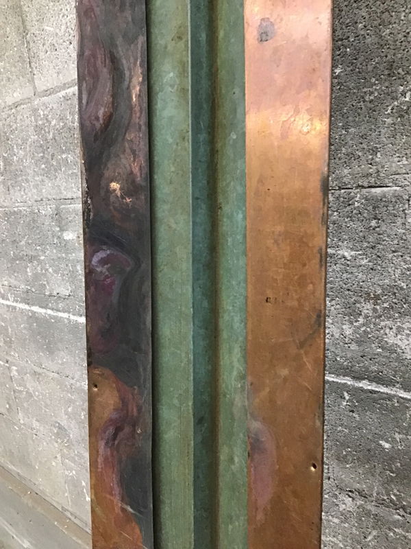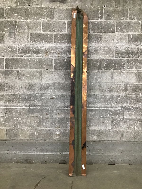 Would you like to add a touch of class to your roofing project? How about using a piece of copper for your valley. Has a 1" crease in the center to give you rigidity and the ability to vary your pitch. The edges have a 3" roll over. If you were to flatten this piece out, it would probably be about 18" wide. This is used material and has fastener holes.