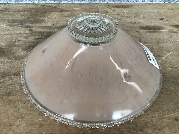 A gorgeous clear glass ceiling light shade from the 1950s with a rosy pink painted interior. Has three holes for hanging from a three-chain fitter.