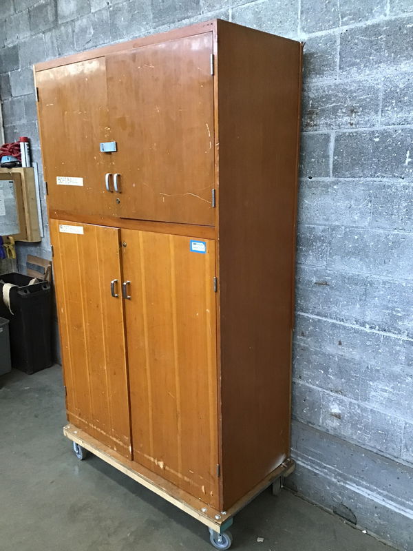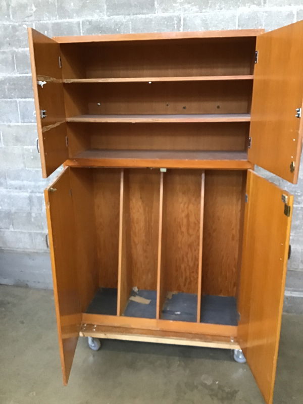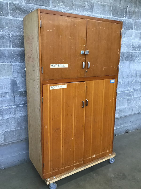 Big basic fir storage cabinet from Rainier Beach High School, looks like it was used in the softball department, great garage cabinet! Includes shelves up top and vertical cubbies behind the big doors.