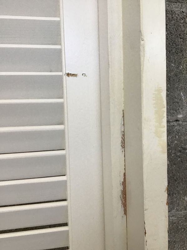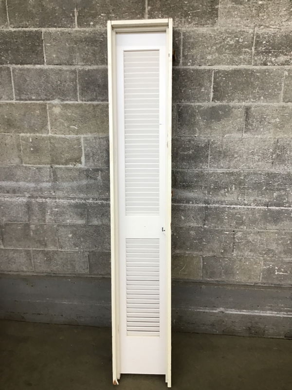 Petite louvered door in jamb, painted white. Ready for a closet, pantry or other such slim entrance.