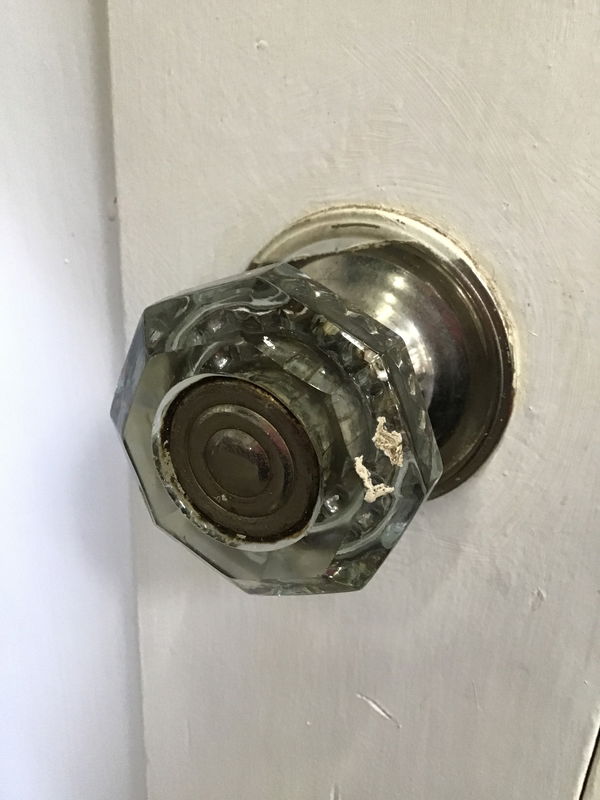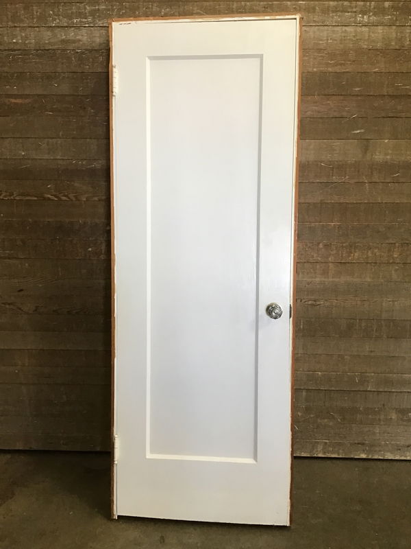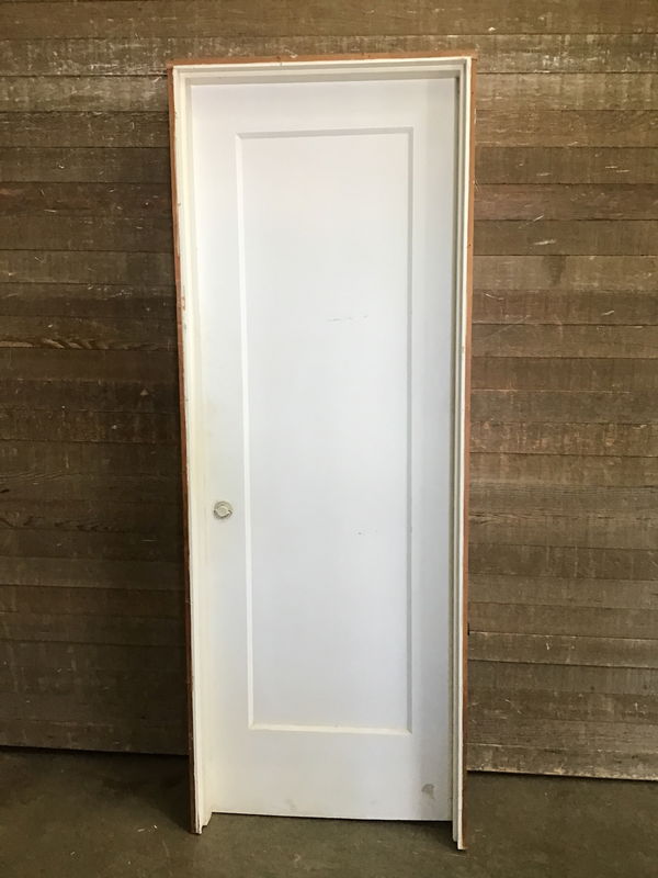 28" vintage single panel interior door, pre hung in jamb. Heavily painted on both sides. May have some minor cosmetic damage, but is in overall good, used condition. Comes with one very cool glass knob.