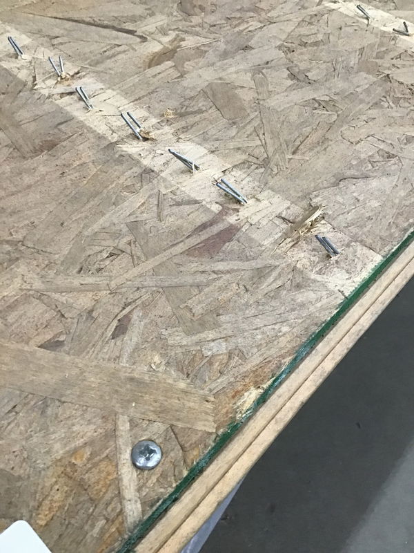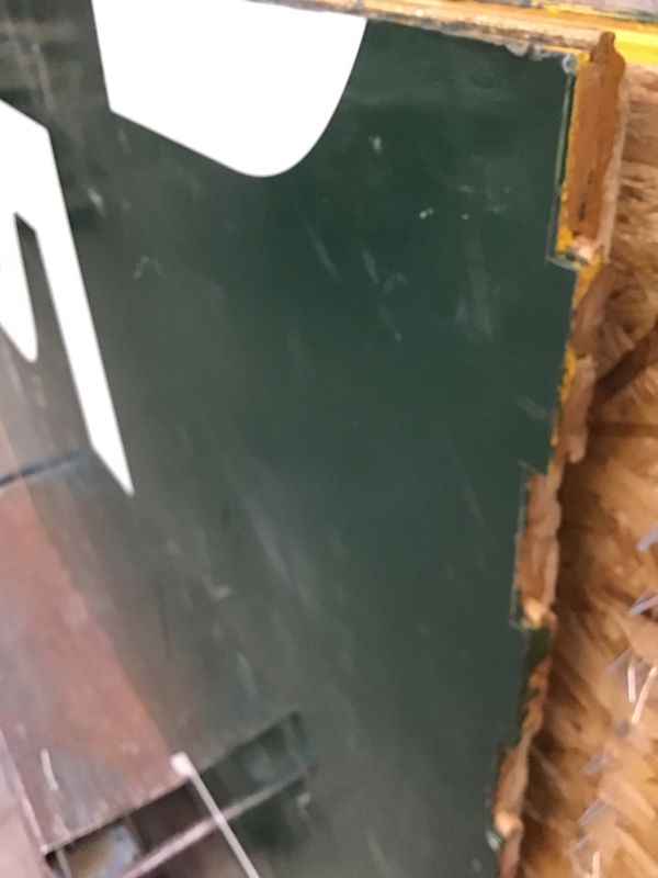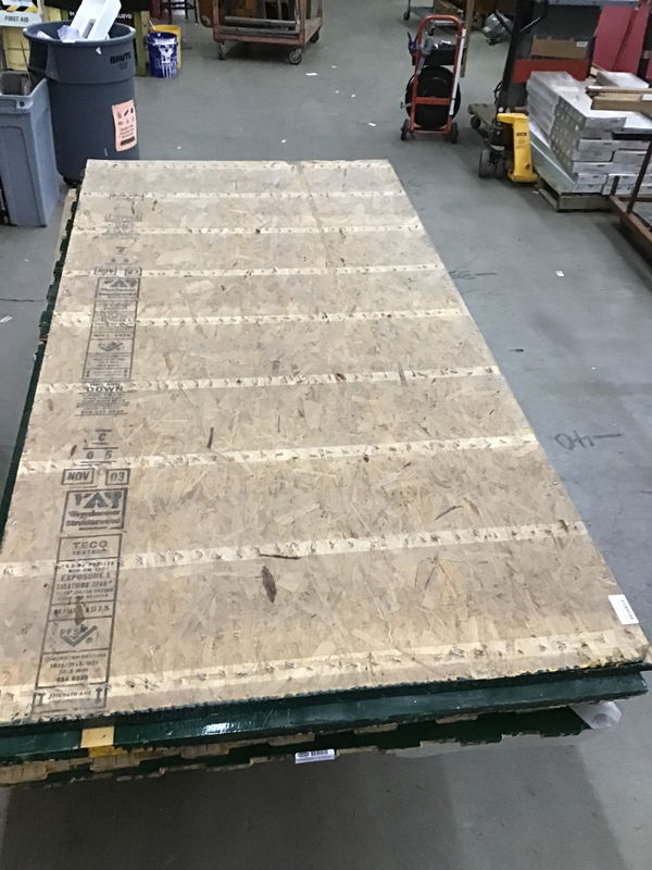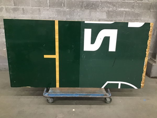 Unlike most of the gym floors we see, which are cut out, these have nice clean edges which would meet up neatly with the next panel. Plus the ends match up with every other two boards being offset. The panels are mounted on a 1/2" thick sheet of OSB. It used to have 1 1/2" high sleepers underneath it, but they've been removed as has any of the interlock system which you'd find on a lot of the panels from this job. In all reality, I'd be tempted to put no sleepers of some type under it just so I didn't have to fight the staples that are protruding from the bottom of the OSB. Price reflects the lack of sleppers, but that could actually be a plus depending on your application. This one has is all green. Dimensions are approximate.