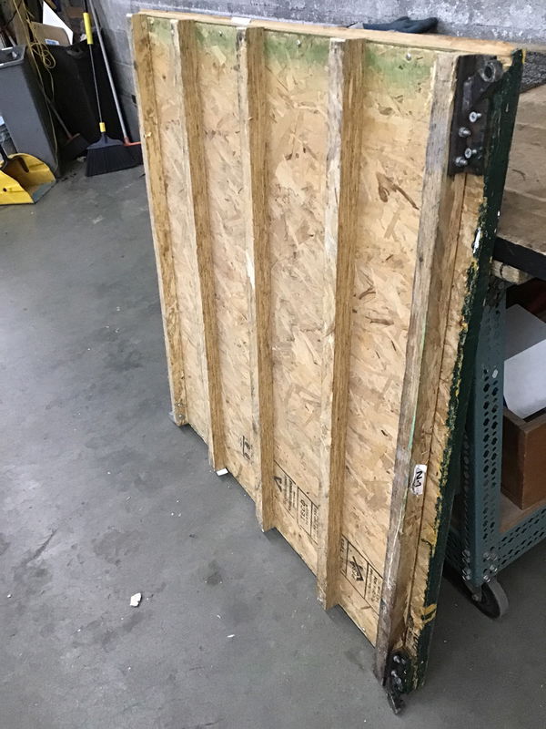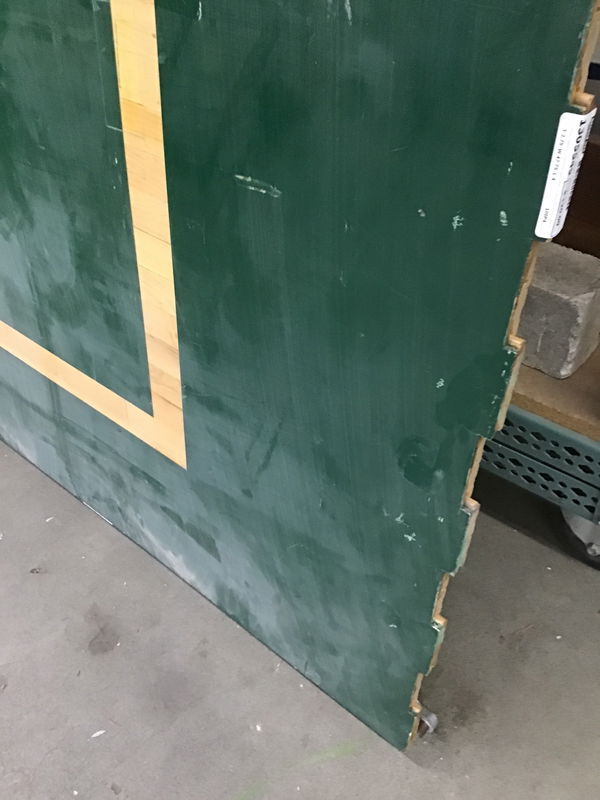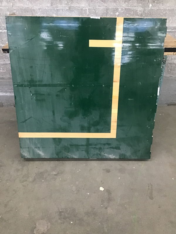 If you need to move your gym floor in and out of your space on a regular basis, this maple flooring might be for YOU! Unlike most of the gym floors we see, which are cut out, these have nice clean edges and a "lock together" system on the edge of each panel. Plus the ends match up with every other two boards being offset. The panels are mounted on a 1/2" thick sheet of OSB, which has 1 1/2" high sleepers underneath it. If you were to put this on a concrete slab, it would raise your floor about 2 3/4". This one is mostly green with a few court lines. Dimensions are approximate.