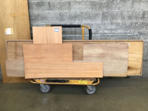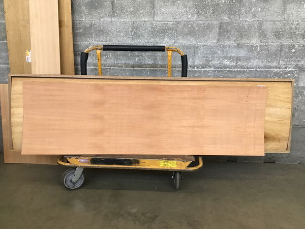 The supplier that dropped this material off said it was Lengue wood, but it also has South American Cherry written next to the Lengue. I don't think it's jatoba or Brazilian cherry, but it is a hardwood veneer on thin 1/8" thick plywood core. I was also told it was used for interior marine applications and that it's still available at Crosscut. There are five full sheets of size listed and some cuts sheets and cutoffs that should yield at least two more sheet worth square footage wise.