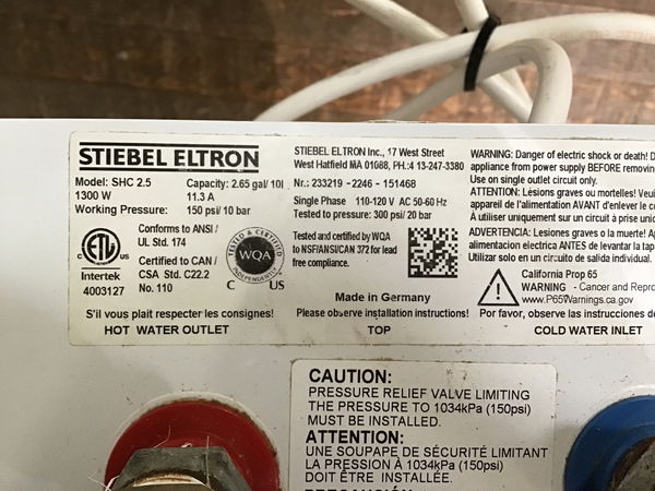 Mini electric Stiebel Eltron water heater that looks to be in good condition. Has a 2.65 gallon capacity, made in Germany, and looks to be wall mountable. Untested in house and sold as is. This model sells close to $190 online, see here.