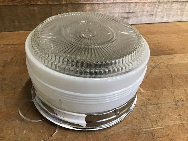 Vintage flush mount cake light in good, used condition. The shade and chrome finished fitter has some paint on the edges. This takes two bulbs. Wiring looks old and may need replacing, no exposed wire but looking a lil' rough. We always recommend a full test prior to installation.