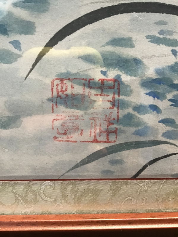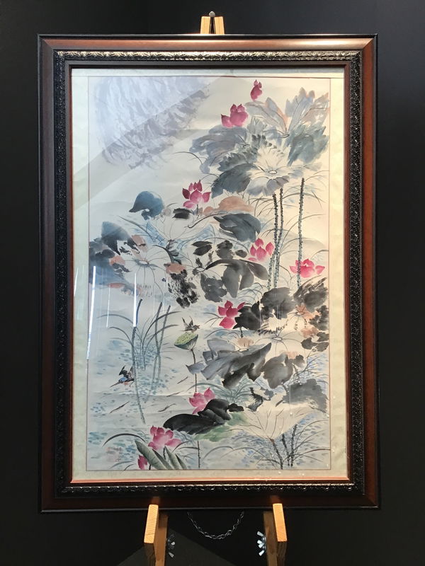 Gorgeous watercolor print from an unnamed Chinese artist as evidence from the stamp on the bottom left corner. Lovely print showing a nature scene with birds, lotus flowers, and plants of all kinds. The frame is also quite stunning with dark finished wood and a fantastic hand carved inner border.