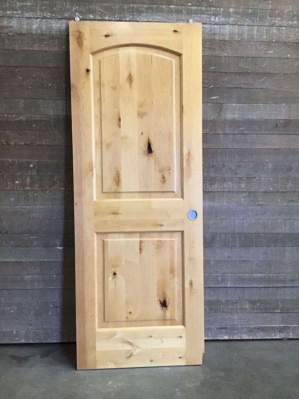 Previously installed Two Panel Knotty Alder Sliding Door. Clear coated on one side. Has cutout on one bottom corner.