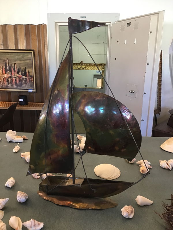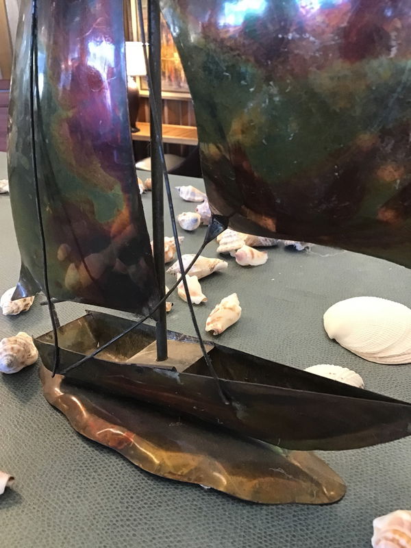 Hand crafted sailing ship sculpture made of brass/copper. Sits on a water shaped base with nice details like the wind swept sail, the mast, and the little flag on top. Cute sculpture seems vintage with a "Made in Hong Kong" sticker on the bottom.