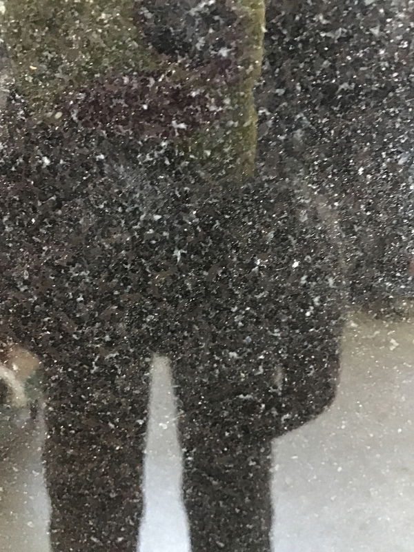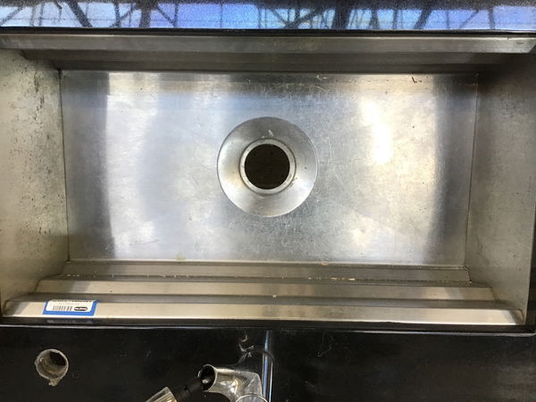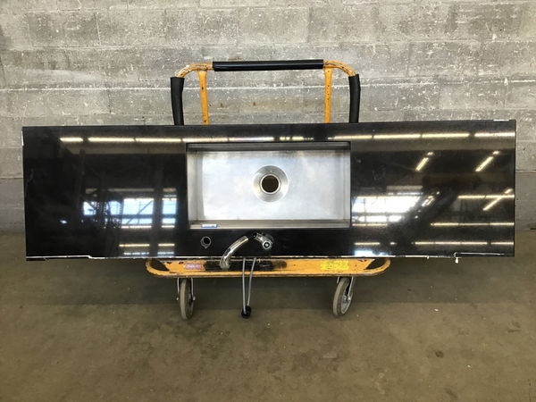 Black manmade stone countertop with finished left and front edge--at least past the 31 1/2" x 16 1/2" designer stainless steel sink which is showing some surface wear and scratches. The last 27 1/4" to the right of the sink is not finished as it had a piece come off perpendicular. From left edge to end of finished front is 66 1/2". Assume the faucet will need to be replaced.