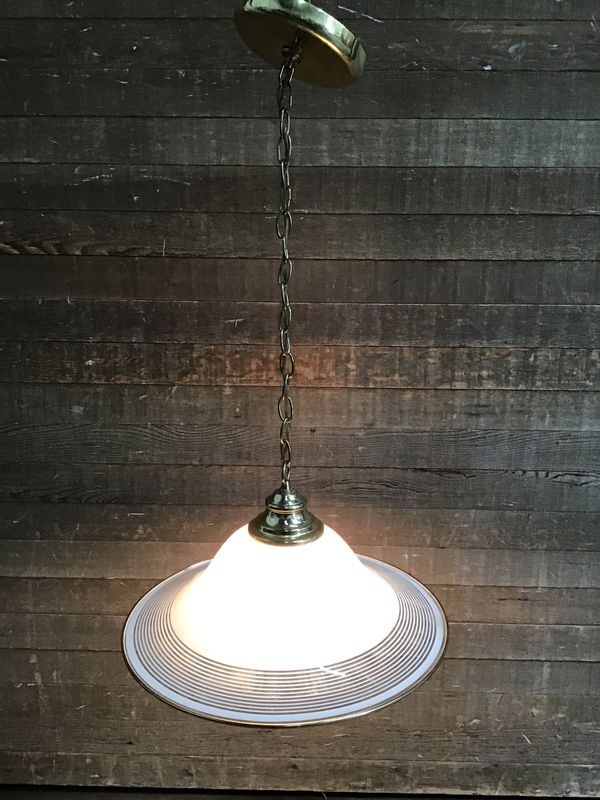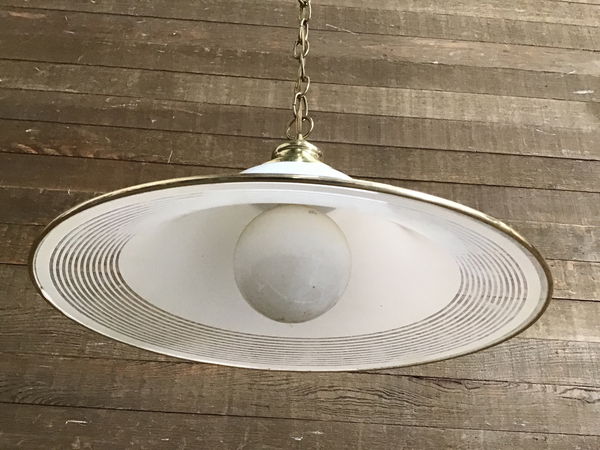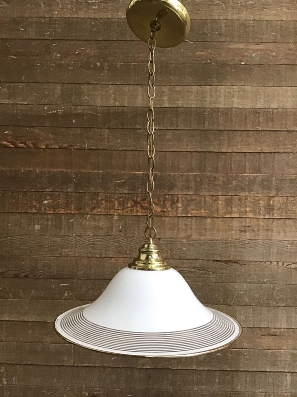 Pretty fun light fixture that's in the shape of a flying saucer. Made with a white plastic shade with clear/white stripes around the edge and brass toned fixtures, this light is in good, used condition. Measurements do not include about 22" of chain.