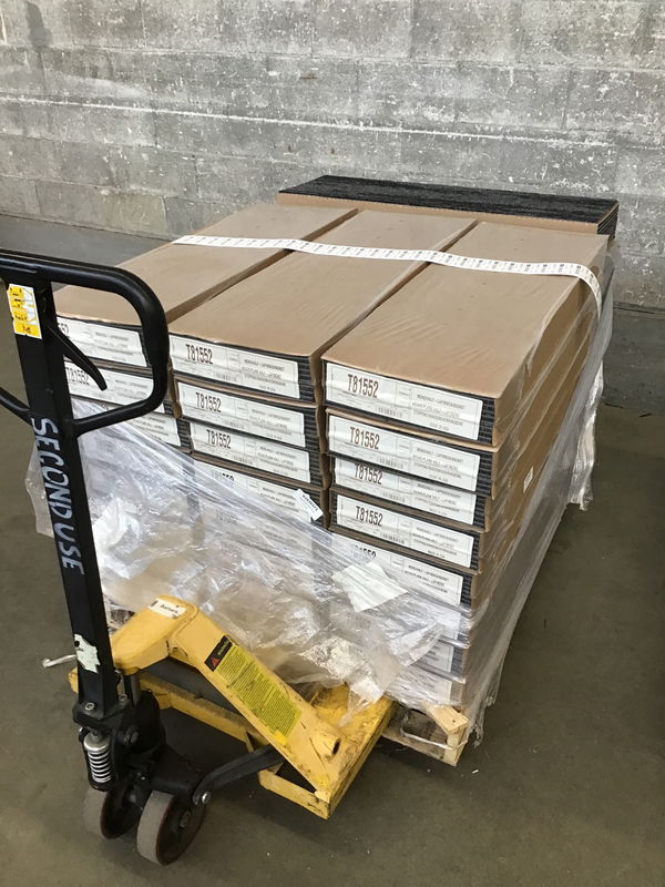 This is a box of carpet tile that contains 54SF of coverage. The style is called "Shared Path" and it is a simple yet inviting mix of black and grey. This is a bulk item; no holds please!
