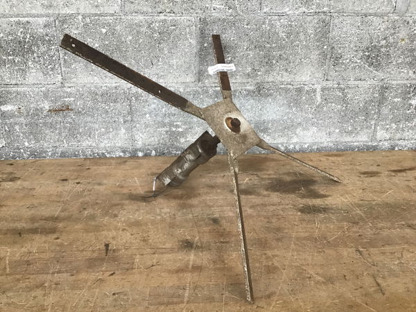 Four arms that look like they once held fan blades. Comes mounted on a spindle, which rests in two pillow blocks.