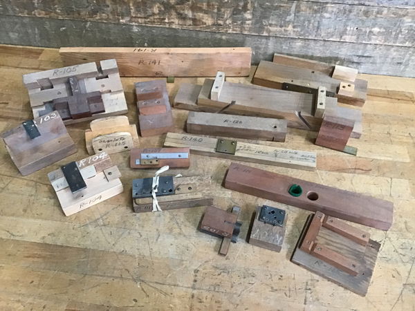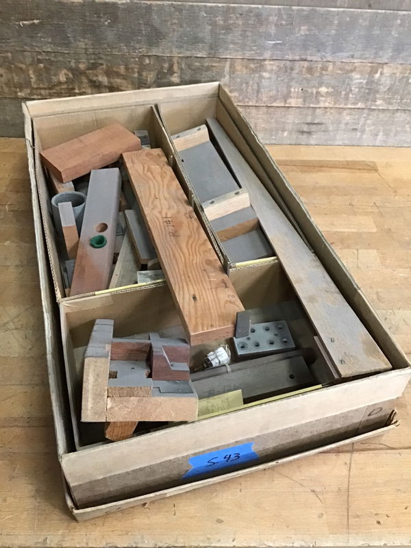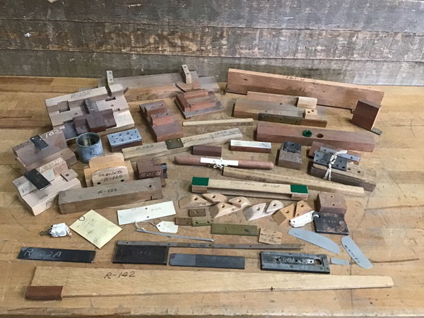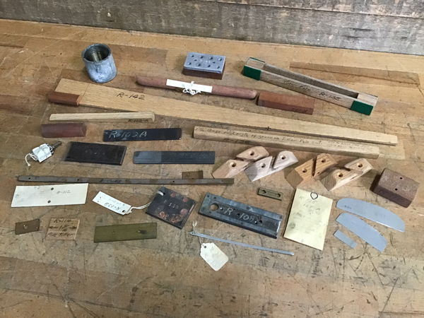 This is a box of vintage tiller poles, guides, lead jigs, samples, other hardware/tools originally used in the construction of canoes. Looks like there are some nice little wood chunks in here including cedar, mahogany, and other hardwoods, all from the Willits Brothers original shop. Great for projects other than boats!
