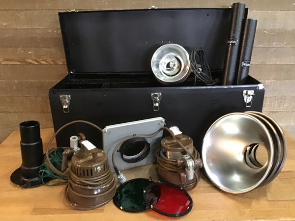 Complete vintage studio lighting kit, includes three M11 Speedotron lights, extra shades, tripods, fabric diffuser/reflectors. Quarts lights, looks like some bulbs and flash tubes are present. Based on prices from the Speedotron website, this is over $2000 worth of equipment.