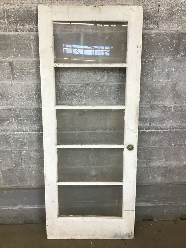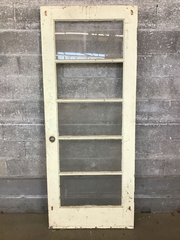 Painted fir five lite (single pane glass) interior door that's missing one pane of glass and has quite a bit of peeling paint. Price reflects. Note width of door. It's still proportioned.