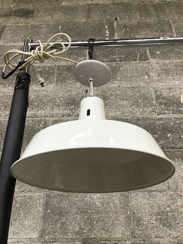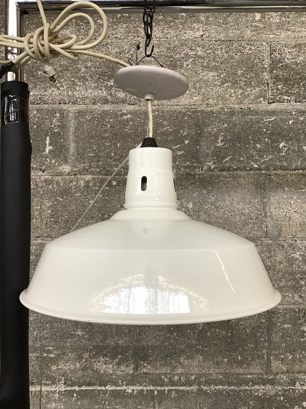 Very clean and free of chips, white enameled steel barn style, cord pendant light. Height listed is minimum height. This one has a plug on one end and plenty of cord to drop it down further than what you see it. This is quite a bit heavier than the IKEA version, but not quite as heavy as an old Benjamin model.