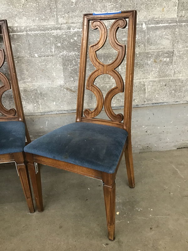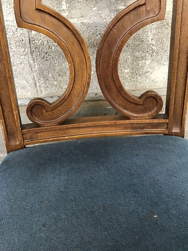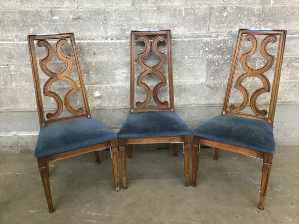 A trio of mahogany dining chairs with classy styles to their construction and seats upholstered in soft blue fabric.