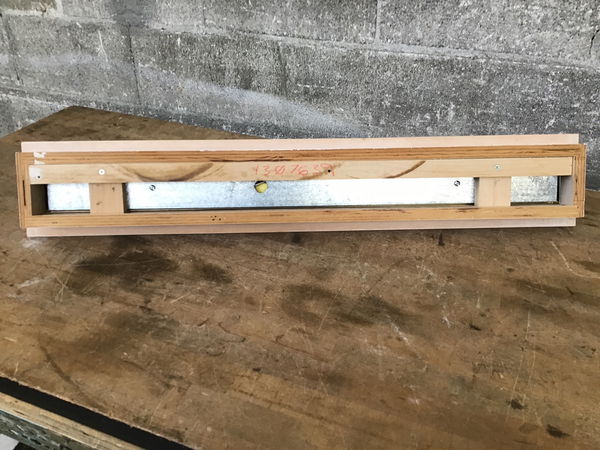A classy vanity light with a brassy canopy, all held within a custom-built white oak frame. It sports five globe bulbs.