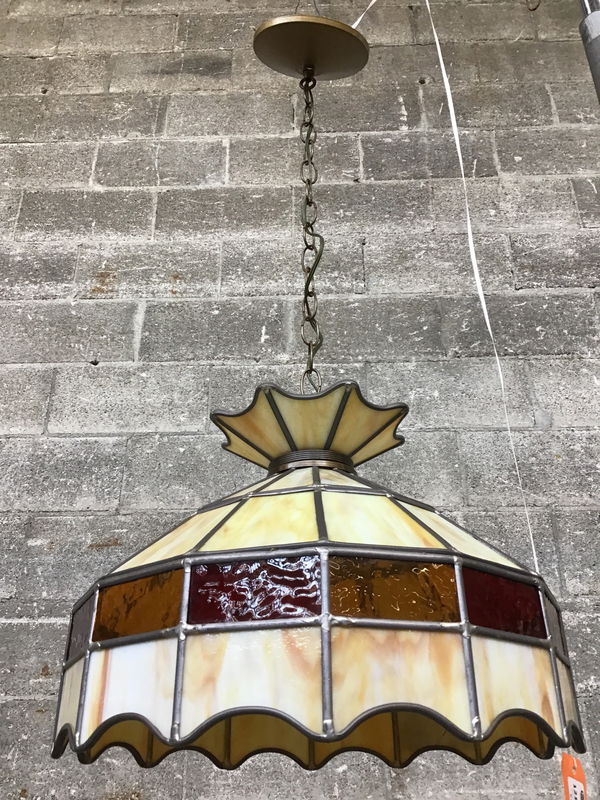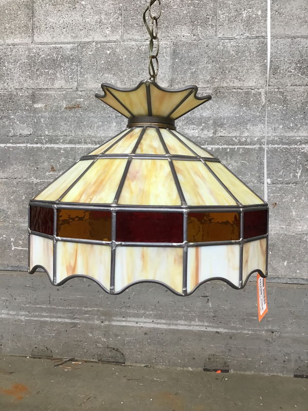 Hanging mid-century stained glass light that makes me think of being at a pizza parlor playing pool. Anyways, its a cute little light, only one inconspicuous cracked pane, wiring looks usable.