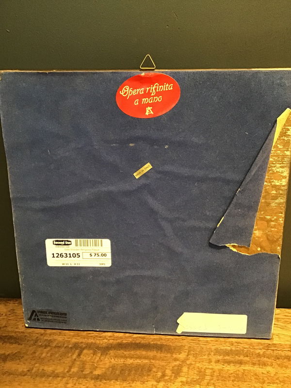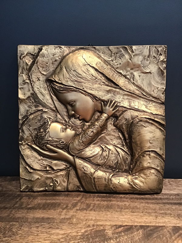 Hard carved and Italian made wooden plaque depicting what I can assume is Mary and Jesus. Heavy wood and hand painted gold with a nice patina. Felt back and info about the piece on the back.