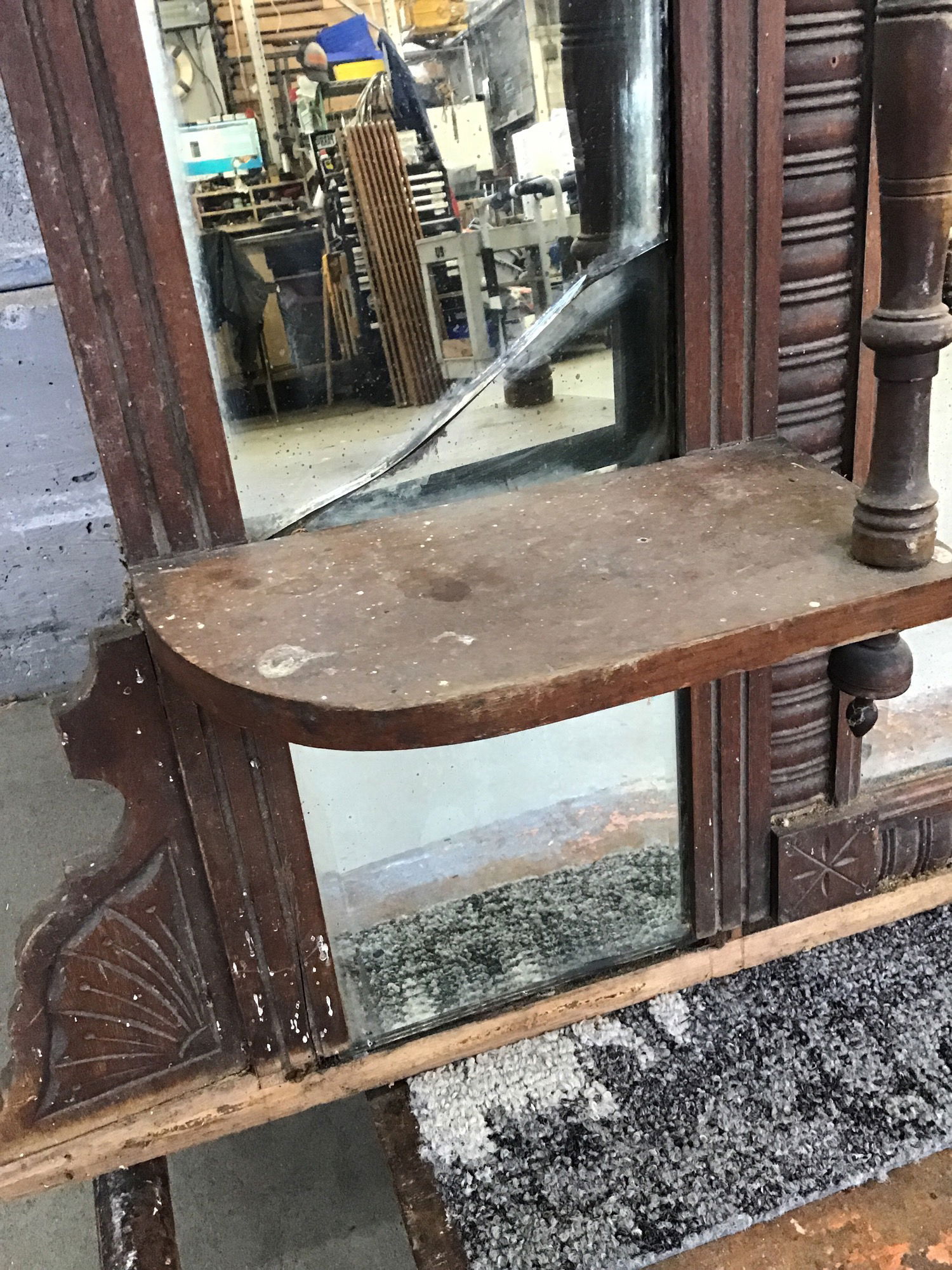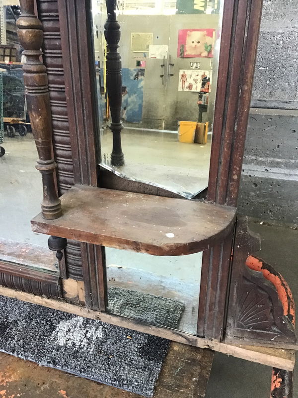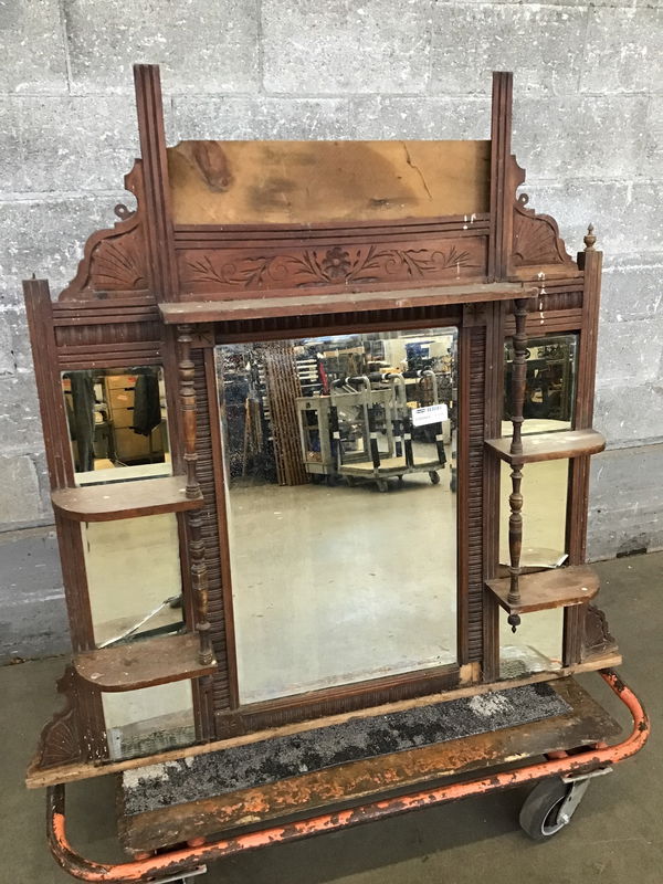 Vintage beveled glass mirror in a carved wood frame surrounded by small shelves and additional accent mirrors. Would look great above a dresser or maybe even behind a small bar! Needs a little elbow grease and two of the smaller mirrors have cracks, price reflects.