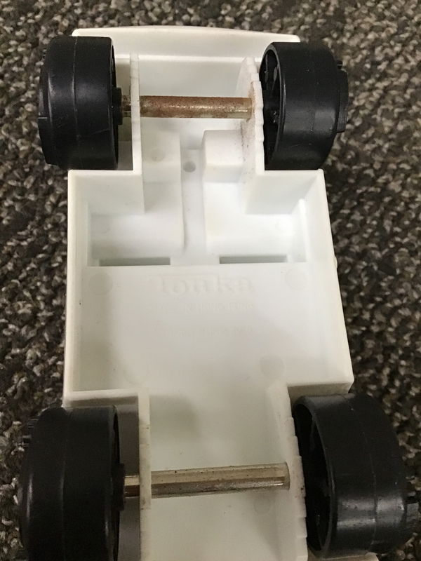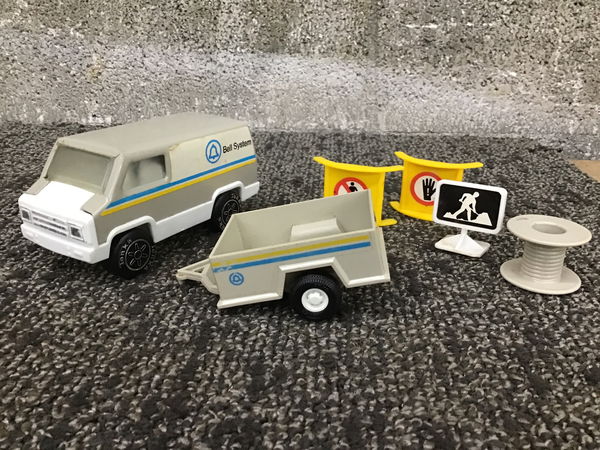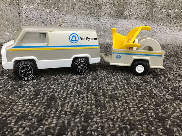 Pretty clean, but lightly used plastic Tonka brand van & trailer with markings for Bell Systems. Made in Hong Kong, as are the wire spool and construction signage that are in the trailer, which is why I think they went together.