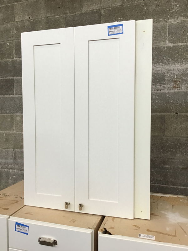 Ca. 2018 Shaker style pro painted white maple face wall cabinet. This one has a 3" spacer attached to the right side, which can be removed easily.