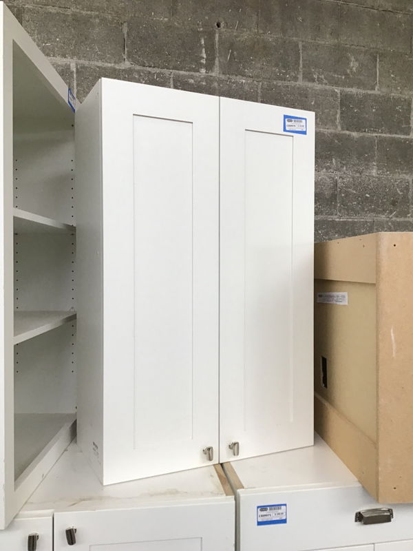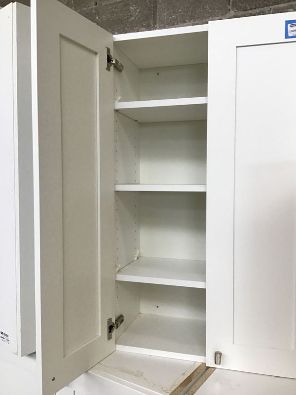 Ca. 2018 Shaker style pro painted white maple face wall cabinet.