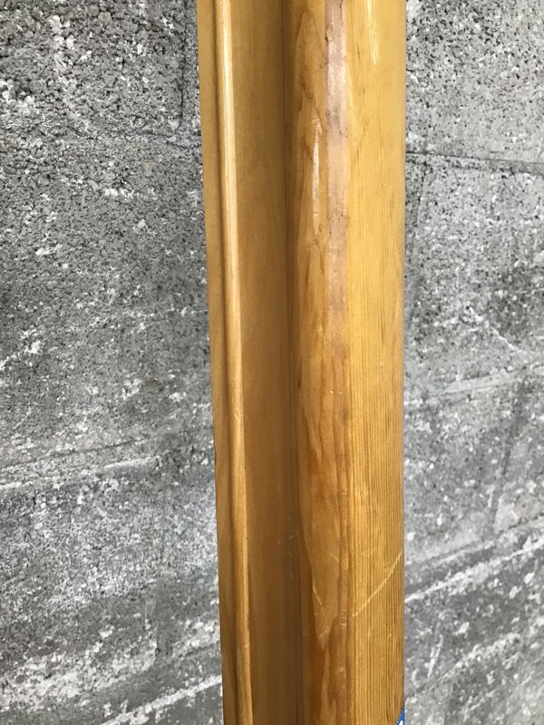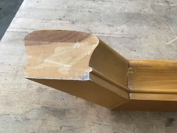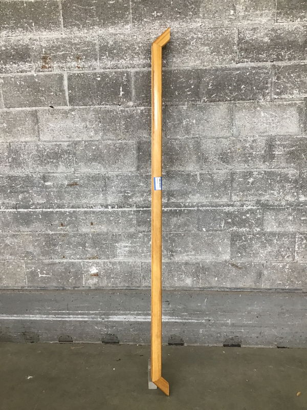 Clear finished, clear ?hemlock? (but might be fir), bread loaf profile hand railing. Length listed is outside of 4" (from wall to outside of railing) beveled return to outside of beveled return. There are no mounting brackets attached.
